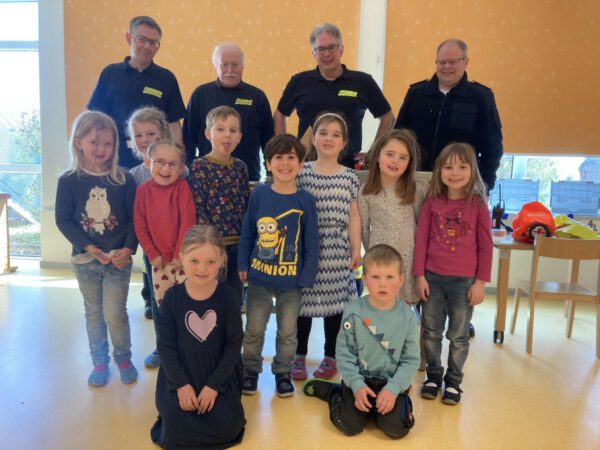 Am Freitag haben einige Kameraden vom Löschzug zwecks Brandschutzerziehung das Familienzentrum „Am Park“ besucht. Bei diesem Termin wurde den Kindern aus vier Gruppen das richtige Verhalten im Brandfall gezeigt und auch das richtige Absetzen eines Notrufes wurde erklärt. Ein Kamerad zeigte sich in kompletter Atemschutzausrüstung um den Kindern die Angst vor diesem ungewohnten Anblick zu nehmen. Außerdem bekamen alle Kinder einen „Kinderfinder“ für ihre Kinderzimmertür. Aufgrund von Corona war dieser so wichtige Termin viele Jahre ausgefallen und wird nun künftig wieder jährlich stattfinden.