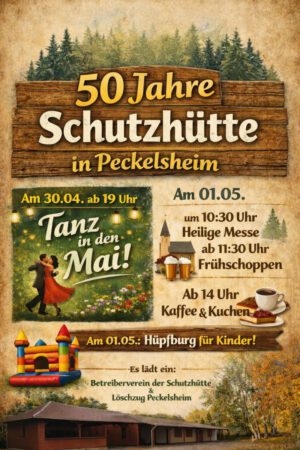 Nach dem großen Erfolg im letzten Jahr anlässlich der Wiedereröffnung der Schutzhütte findet auch in diesem Jahr wieder ein Tanz in den Mai statt. Ob jung oder alt – alle sind herzlich eingeladen, gemeinsam den Frühling zu begrüßen und bis in den Mai hinein zu feiern. Für Leckeres vom Grill sowie Getränke ist natürlich gesorgt. Somit muss niemand hungrig oder durstig bleiben. Doch damit nicht genug – am 1. Mai geht das Fest in die nächste Runde: Der Tag beginnt mit einer heiligen Messe, bei der alle herzlich willkommen sind, gemeinsam in den Mai zu starten. Im Anschluss lädt ein gemütlicher Frühschoppen zum Verweilen ein. Bei guter Stimmung und geselligem Beisammensein kann der Feiertag entspannt genoßen werden. Auch an die kleinen Gäste ist gedacht: Eine Hüpfburg sorgt für Spaß und Bewegung und macht den Tag zu einem Erlebnis für die ganze Familie. Kommt vorbei und verbringt zwei schöne Tage voller Gemeinschaft, guter Laune und Frühlingsstimmung an der Schutzhütte in Peckelsheim.